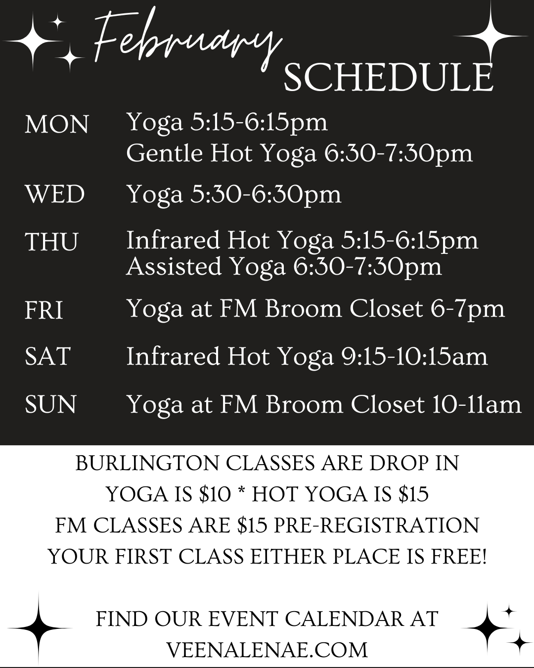 To sign up, send the studio a message on social media, or register online here: https://www.veenalenae.com/offers/YpGZz23K/checkout