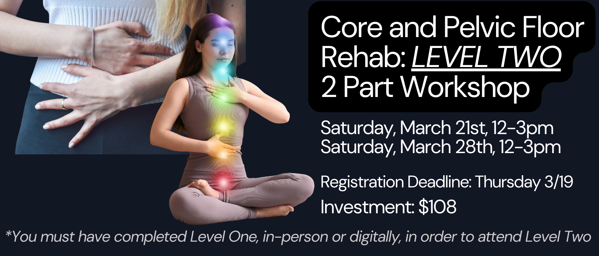 LEVEL ONE COMPLETION: By signing up for this workshop, you confirm that you have completed Core & Pelvic Floor Rehab: Level One with Rachel either in-person or online.
